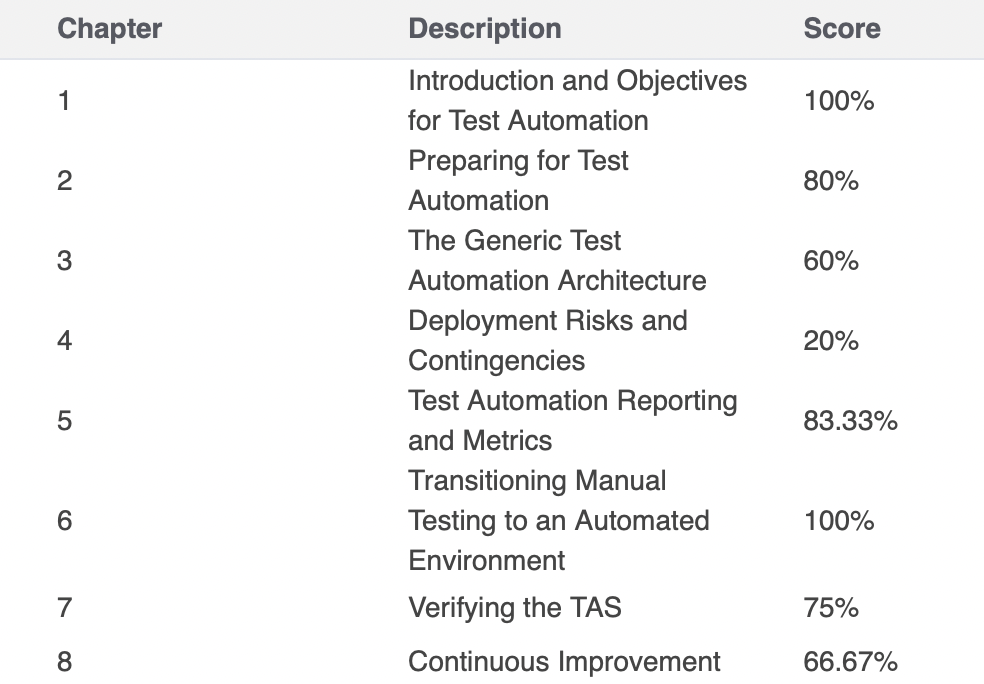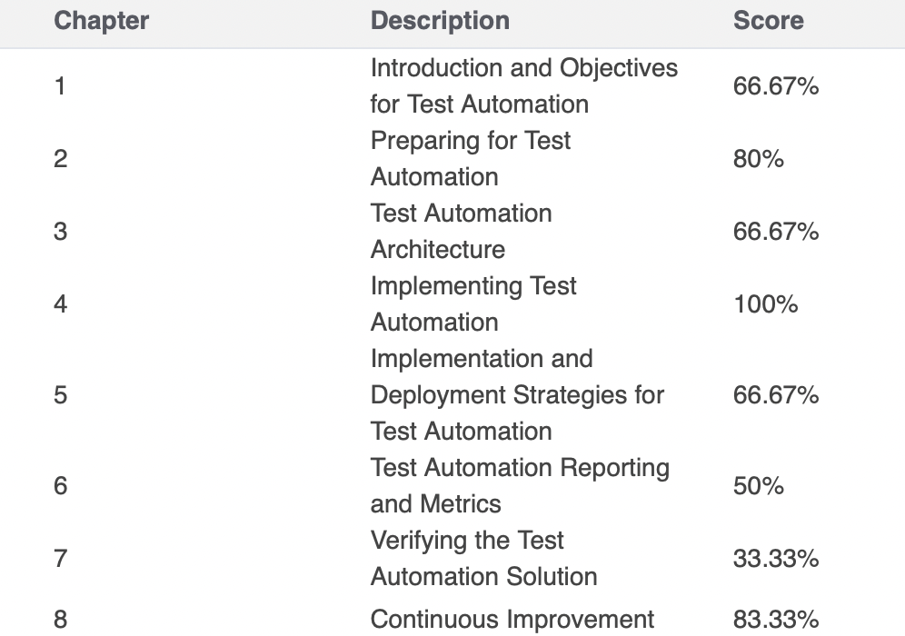 The lower percentages on Chapters 6 and 7 also make sense. I’m still in the phase of learning how to verify and improve existing automation solutions and how to tailor reporting for different stakeholders. Most of my real experience has been in building frameworks from scratch, not reviewing or extending someone else’s architecture.